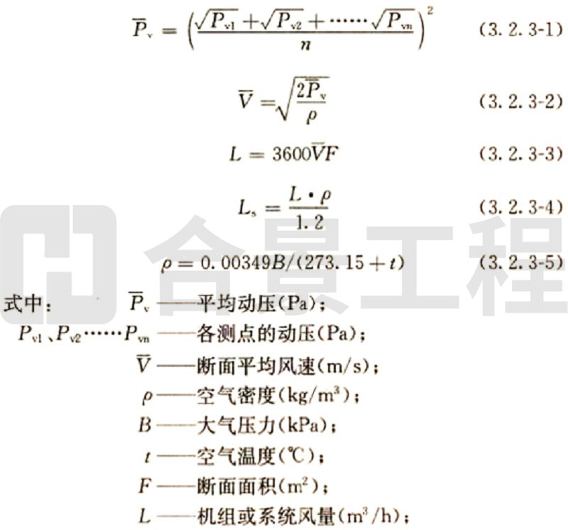 (2)當(dāng)采用熱電風(fēng)速計或數(shù)字式風(fēng)遺計測量風(fēng)量時,斷面平均風(fēng)速為各測點風(fēng)速測量值的平均值,實測風(fēng)量和標(biāo)準(zhǔn)風(fēng)量的計算方法與畢托管和微壓計測量計算方法相同。